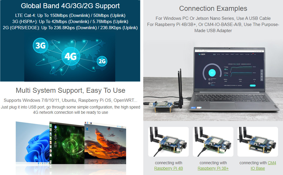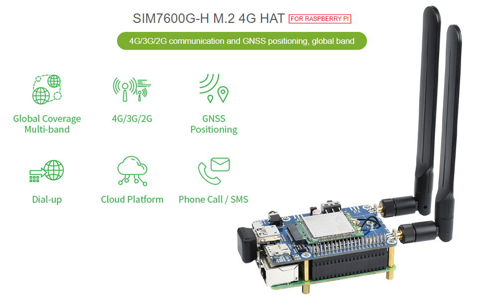 WaveshareSIM7600G-H M.2 4G HAT for Raspberry Pi LTE CAT4 High Speed Global Coverage Multi Band 4G/3G/2G Communication and GNSS Positioning